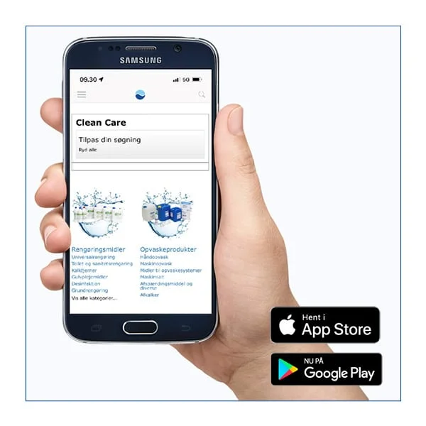 Du skal bruge dit login til webshoppen for at få adgang til appen. Hent i App Store eller på Google Play. Søg efter ”Bunzl Clean Care”.